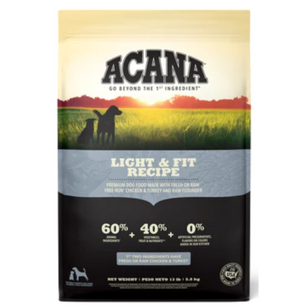 Help your dog stay lean and healthy with ACANA Light & Fit Recipe, crafted with 65% premium animal ingredients including fresh Canadian chicken and raw flounder. Specially designed to support a healthy weight, this grain-free formula is packed with protein and fiber to keep your dog satisfied and fit.