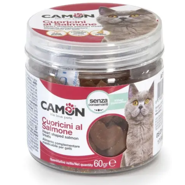 Heart shaped salmon treats with taurine, feed material for adult cats.