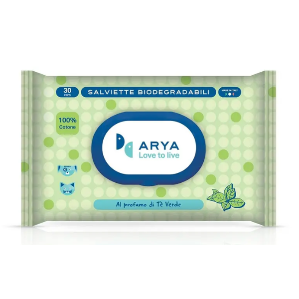 ARYA is the Italian brand of products created for the care and hygiene of dogs, cats and the environments in which they live. ARYA products are strictly Made in Italy, made with raw materials of natural origin, extracts and essential oils from organic farming and the entire production chain takes place in Italy, to guarantee controlled, ethical and environmentally friendly products. The ingredients used have obtained the approval of the EcoBioControl scientific committee, a body that promotes the use of raw materials from renewable plant sources and grown according to organic farming methods, in the detergency and cosmetics sector, both human and animal. All the formulas have been verified through inspection visits to the production plant to check the correspondence between what is declared in the formula and what is actually produced. All the formulas were found to comply with the EcoBioDictionary drawn up by the organization, obtaining its approval. ARYA Biodegradable Wet Wipes are specifically designed for the care and hygiene of dogs and cats, with an eye to the environment. They are made using a 100% cotton fabric, a biodegradable material, and soaked with natural substances and delicate fragrances. They cleanse and deodorize delicately, respecting the physiological PH of dogs and cats, both adults and puppies, and have little impact on the surrounding environment. Ideal on a walk or on any occasion when it is necessary to clean the animal without resorting to a full bath, the pocket size allows you to always have them with you. The Green Tea scented wipes are soaked in a refreshing solution and release a delicate fragrance that does not disturb the sensitive smell of animals. Composition: WATER, PROPYLENE GLYCOL, PEG-40 HYDROGENATED CASTOR OIL, PHENOXYETHANOL, DISODIUM EDTA, PEG-8 CAPRYLIC / CAPRIC GLYCERIDES, PARFUM, ETHYLHEXYLGLYCERIN, SODIUM HYDROXONE , SYMETHONE. How to use: Use a towel passing it on the fur or paws of the animal. Close the package carefully in order to preserve the humidity of the product. Dispose of in household waste, do not throw in the toilet. No rinsing required