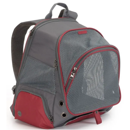 Practical and functional backpack carrier, in the two-color grey/burgundy. The mesh inserts promote excellent air circulation and, moreover, allow the animal to look around. Equipped with a side storage pocket with opening for hygiene bags and a convenient lower pocket into which a collapsible bowl can be placed. The product also comes with an internal safety leash. Designed for pets up to 5/6 kg. Size: 34x22x42 cm