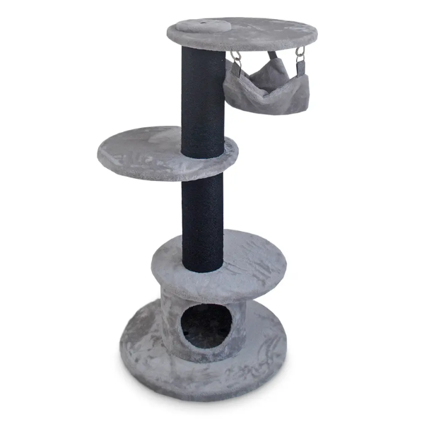 Sturdy Scratching Post with Soft Platforms and Hideaway. Giorgia by duvoplus is a medium-sized, stable scratching post with 3 comfortable lying platform, shelter house in soft plush, so there is plenty of space for your cat to scratch, look out and rest. The scratching post is finished with a hammock. The post, 15cm thick, is lined with robust sisal for sharpening nails. Cats also like to rub off their pheromones on a scratching post to reduce stress.