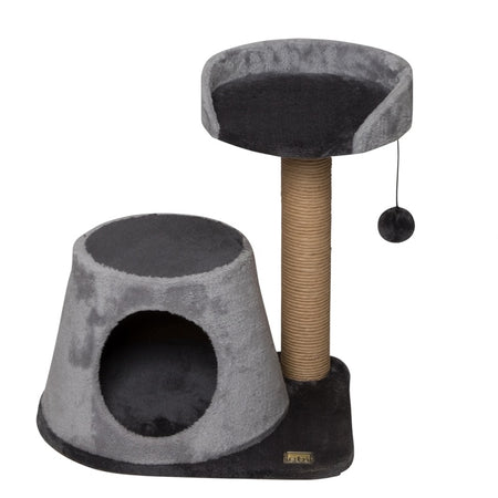 - Scratching tree with very strong sisal completely glued to the post * High-quality plush * With sleeping house and play ball * Post of Ø 75 mm * Suitable for more active kittens & (house) cats * Size - 45 x 35 cm