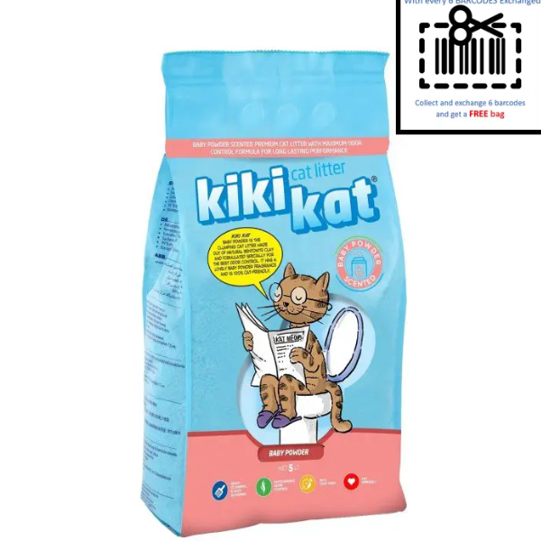 Clean litter box, lovely scent. KikiKat Baby Powder is a premium clumping cat litter made from natural bentonite clay, infused with a soft, fresh baby powder fragrance for a pleasantly scented home. Formulated for maximum odour control and long-lasting performance, it clumps fast for quick and easy scooping — keeping your cat's litter box fresh all day long.