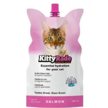 KittyRade is an award-winning functional health drink for cats fortified with prebiotics, electrolytes and essential amino acids. It aids digestion while encouraging reliable hydration whilst nourishing and promoting a healthy gut. It contains taurine to support eye and heart health. It can be served chilled, warmed or frozen. In taste test trials, cats drank nine times more KittyRade than water.