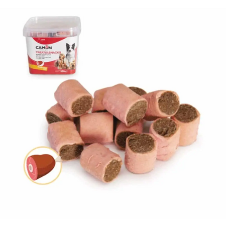 Rollos Biscuits with Ham, complementary feed for adult dogs. Composition : cereal flour, processed animal proteins (pork 19.6%), animal fat (poultry), beet sugar, vegetable oil and fats, sodium chloride. Additives : preservatives, antioxidants, dyes. Instructions for use: give dogs over 6 months of age as a tasty snack or treat at any time of the day, from 1 to 8 pieces (1 piece = approximately 12-15 g) per day depending on the size, adapting accordingly the daily food ration. Monitor the dog while he eats the snack and always leave a bowl of fresh, clean water available. Close the package tightly after use. Keep in a cold and dry place. Analytical components: 19% crude protein, 1.5% crude fiber, 18% crude fat, 7.5% crude ash, 8.5% humidity. Pack of 530 grams