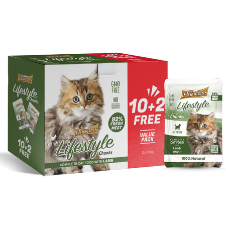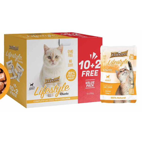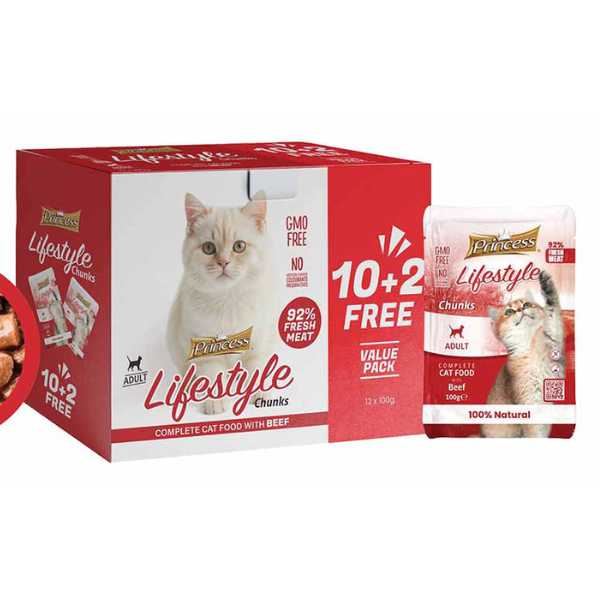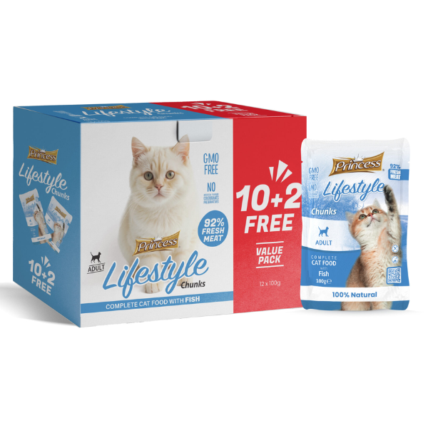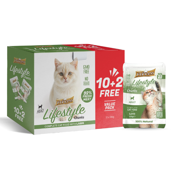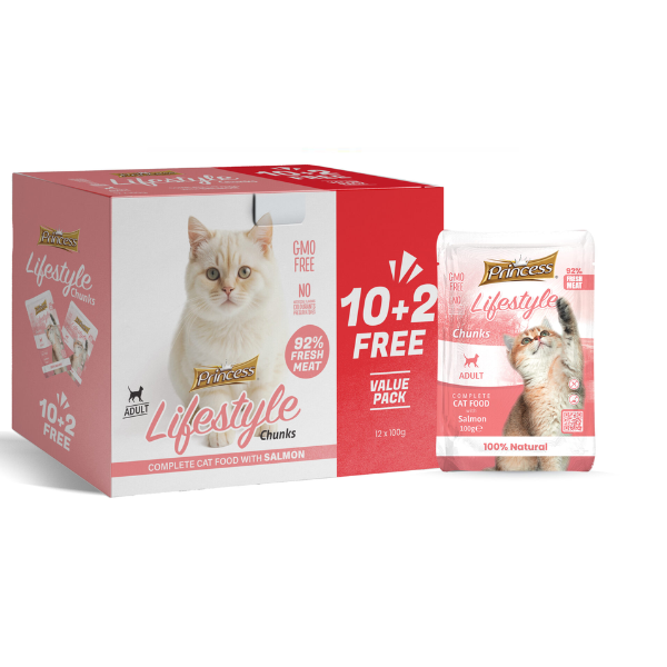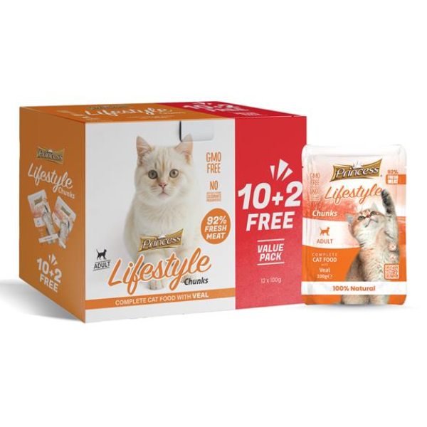 Princess Lifestyle Chunks is a complete cat food made with 92% fresh meat, available in delicious flavours like salmon, lamb, fish, veal, chicken, and beef. GMO-free and 100% natural, it provides balanced nutrition for adult cats and kittens, supporting energy, health, and a shiny coat. Convenient value packs with extra pouches included.