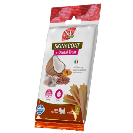 N&D Quinoa Skin & Coat Dental Treat Mini (Herring) is a functional dental snack designed for adult small breed dogs with sensitive skin or coat concerns. Made with herring as a single animal protein source and enriched with quinoa, coconut, and turmeric, it helps support healthy skin, a shiny coat, and overall wellbeing. The crunchy texture aids in reducing plaque and tartar, while omega-3 fatty acids and antioxidants promote oral hygiene and skin health.