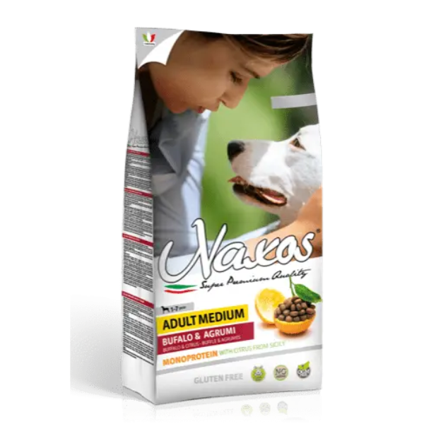 Naxos Adult Medium with Buffalo and Citrus is a complete single-protein , gluten-free dry food indicated for the maintenance of adult medium-sized dogs. Buffalo meat as the first ingredient in the label is a protein source with high biological value, high digestibility and rich in minerals.