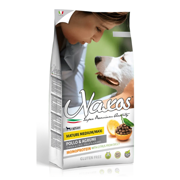 Naxos Mature Medium e Maxi – Chicken & Citrus is recommended for the maintenance of adult dogs over six years old. The integration of chondroitin and glucosamine strengthens cartilages and contributes to joint health. Prickly pear seeds rich in vitamins make the skin supple and the coat shiny.