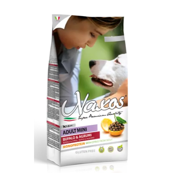 Naxos Adult Mini - Buffalo and Citrus is our monoprotein and gluten free product recommended for the maintenance of adult small dogs. Buffalo meat is a high biological value protein source, it is highly digestible and rich in mineral salts.