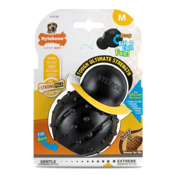 The Nylabone StrongMax Fill & Chill is the ultimate chew toy for medium dogs who mean business. Stuff it with peanut butter, banana, yogurt, or kibble, then freeze it for a long-lasting, mentally stimulating challenge. Built with tough ultimate strength rubber and infused with beef flavour, it satisfies even extreme chewers — treat after treat.