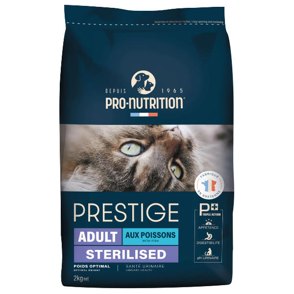 STRENGTHENING OF THE URINARY SYSTEM - LIMIT HAIRBALLS - OPTIMAL WEIGHT Neutered, less active adult cats need a complete, low-calorie diet to maintain optimal body condition and good health. Your cat will love the exquisite flavor of our PRESTIGE CAT ADULT STERILIZED fish croquettes . The presence of fibers (hypocaloric formula), an optimal rate and quality of proteins and a reduced fat content to avoid weight gain without reducing the volume of the daily ration. The integration of L-Carnitine to help your companion make better use of fat and therefore maintain its ideal weight. The use of high quality proteins and natural fibers (beans and apples), to reduce the feeling of hunger and guarantee good digestion . Flax seeds and fish autolysates, sources of fatty acids and peptides, along with vitamin E, biotin and zinc, to contribute to healthy skin and a shiny coat . Controlled intake of minerals, essential to avoid renal overload , maintain an optimal urinary pH and limit the risk of urinary stones . The combination of malted wheat and plant extracts and a suitable cellulose rate to limit the formation of hairballs .