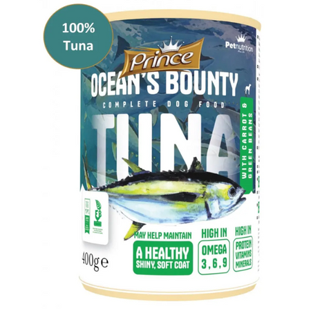 Prince Ocean’s Bounty Tuna Dog Food (400g) – Made with 100% tuna and natural ingredients, rich in protein, Omega 3, 6 & 9 for a healthy, shiny coat. Complete and nutritious meal for dogs.