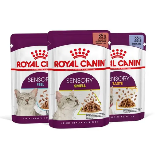 Have you ever wondered how your cat experiences the world? A cat’s senses are their gateway to the world. How those senses are stimulated ultimately determines how your cat feels. That means, mealtime and nutrition are important for their overall health. Keep reading to learn how you can offer your cat a better sensory experience and help to improve their wellbeing every day. Understanding a cat's super senses Felines are unique for many reasons, but the distinct nature of their senses is key to understanding how to enhance their wellbeing. Consider this: a feline’s sense of smell is 14 times more powerful than a human's. However, cat taste buds only total around 470, which means whilst cats can taste, it's not their strongest sense compared to humans who usually have over 9,000 taste buds. These are but a few sensorial particularities among cats that have been overlooked in pet nutrition, despite the great impact of the senses on their food preferences. Until now. Using our feline expertise and the latest research on cat food palatability, Royal Canin® has created an entire wet food range specifically designed to stimulate cats’ unique senses. Discover the three different products tailored to your cat’s smell, taste, and feel, that will offer variation, a sensorially-rich experience, and help support their overall wellbeing every day. SENSORY™ SMELL Stimulate their sense of smell How strong is a cat's sense of smell? Cats possess up to 200 million odour-sensitive cells in the nose while humans only have 5 million. Given that developed sense of smell, your cat’s first contact with food is through their nose and all those powerful and numerous olfactive receptors, which puts a lot of pressure on that first aromatic impression! This initial contact is further enhanced by sniffing: the more your cat sniffs, the more molecules they can detect. If a cat is greatly attracted to their food’s aroma, they will sniff less and begin eating immediately, making mealtimes easier and more enjoyable. As a result, that first impression is key to ensuring the feeding ritual is smooth and facilitates the consumption of the right amount of energy for your cat, in addition to being enjoyable. As a result, Royal Canin’s Sensory™ Smell formulas are crafted with an aromatic profile made from sustainable fish characterised by fatty, fruity, and nutty odours that are highly attractive to a cat’s sense of smell. The aroma profile has a composition technology that allows flavours to diffuse more rapidly and intensely around the food, making for a successful start to the meal and an overall immersive experience for your cat. SENSORY™ TASTE Unlock their sense of taste Your cat's sense of taste isn't the strongest due to having few taste buds. So what can cats taste? With a uniquely specialised sense, they are particularly perceptive of subtle food flavours, especially umami. Umami is often described as a savoury taste that is found especially in meats. Amino acids are critical to obtaining an umami flavour, which is independent of the other four traditional basic tastes — sweet, sour, salty, and bitter. Because of their carnivorous predisposition, cats are sensitive to the meaty flavours associated with umami. Royal Canin’s Sensory™ Taste formulas are crafted with a chicken taste characterised by toasted, meaty, sulfurous and caramelised hints that will stimulate your cat’s unique sense of taste. SENSORY™ FEEL Reinforce their sense of texture During meals, the sensation of different textures in your cat’s mouth strongly influences their feeding experience. This sensory characteristic known as mouthfeel involves the detection of a wide range of physical stimuli inside the mouth. It involves a food’s entire physical and chemical interaction with the mouth from the first bite and initial perception on the palate, onto chewing, and the concluding act of swallowing. In other words, eating is a tactile experience as much, if not more, than a gustative one, for cats. That’s why Royal Canin’s Sensory™ Feel improves mouthfeel, further stimulating your cat’s senses whilst bringing surprise and enrichment to mealtime. Its formulas are crafted with unique gravy and jelly textures that are creamier with a smoother coating that will last longer in your cat’s mouth. The unique texture also includes more roughly cut meaty chunks which appeal to cats and provide variation in textural sensations throughout your cat’s meal. Discovering your cat is enjoying their meal Enhance your cat whisperer capabilities! It’s possible to detect signs of meal approval long before the food reaches your cat’s bowl. Keep an eye on these meal appreciation indicators before, during, and after the meal.