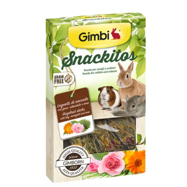 Treat your small pet to something special with Gimbi Snackitos Hazelnut Sticks — grain-free snacks made from natural hazelnut wood enriched with hay, marigold, and rose. Crafted by Gimborn since 1855, these high-quality sticks satisfy the natural gnawing instinct of rabbits, guinea pigs, and other rodents while supporting healthy teeth. A wholesome, fragrant treat your small animal will love.