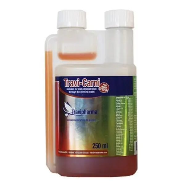 Product Description * Travi-Carni is a dietary supplement for pigeons with L-carnitine and enriched with vitamins and amino acids to improve performance during the racing season.